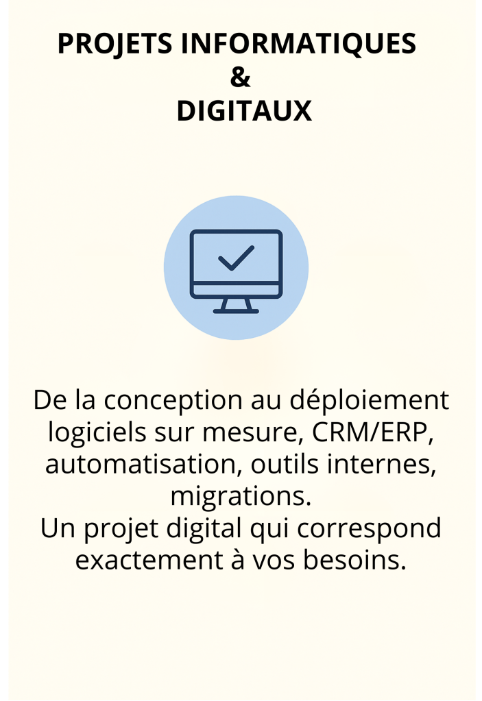 Nous prenons en charge vos projets informatiques : création de logiciels sur mesure, mise en place de CRM/ERP, automatisation, optimisation d’outils internes ou migrations. L’objectif est simple : vous fournir des outils fiables, efficaces et adaptés à votre manière de travailler, du début du projet jusqu’à sa mise en service.